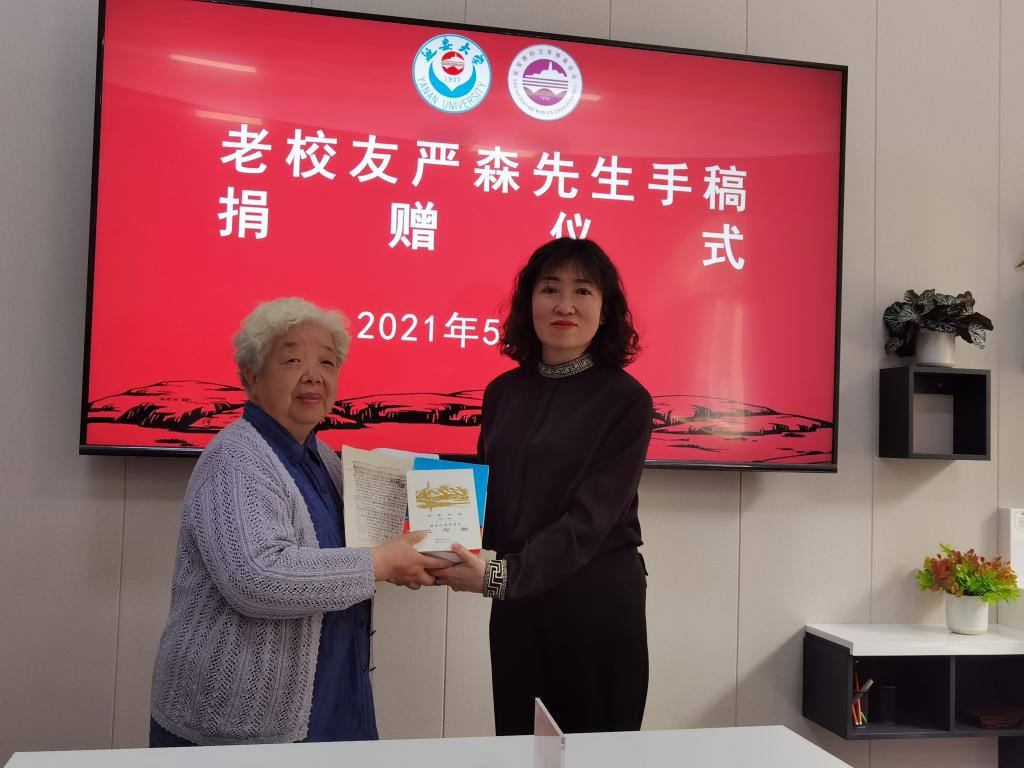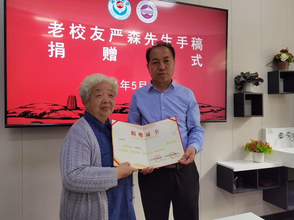 5月17日下午,已故校友严森子女严苏华、严苏建、严苏会在杨家岭校区“校友之家”向学校捐赠了其父手稿等物品。我校副校长付峰,党政办、发展规划处、对外交流与合作处等部门相关负责同志参加了捐赠仪式。