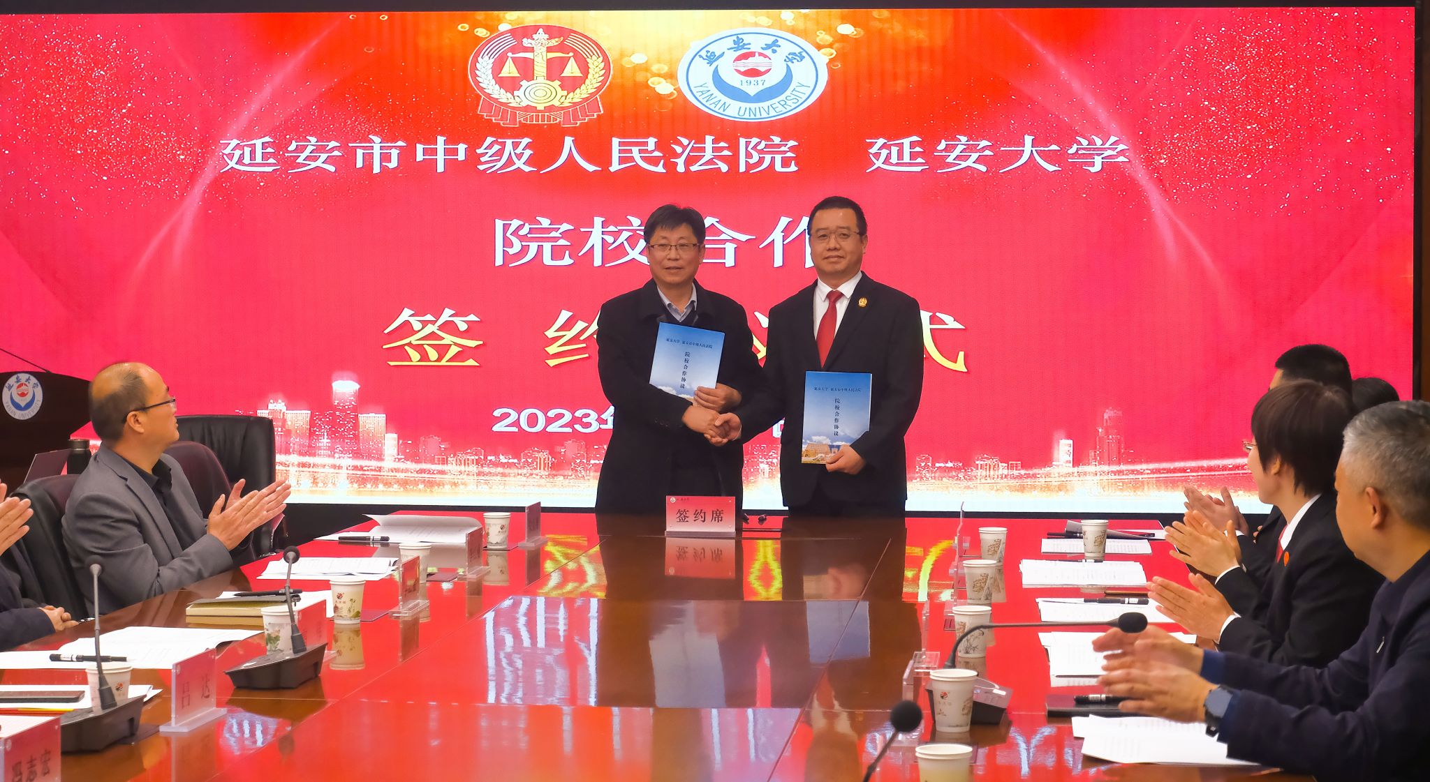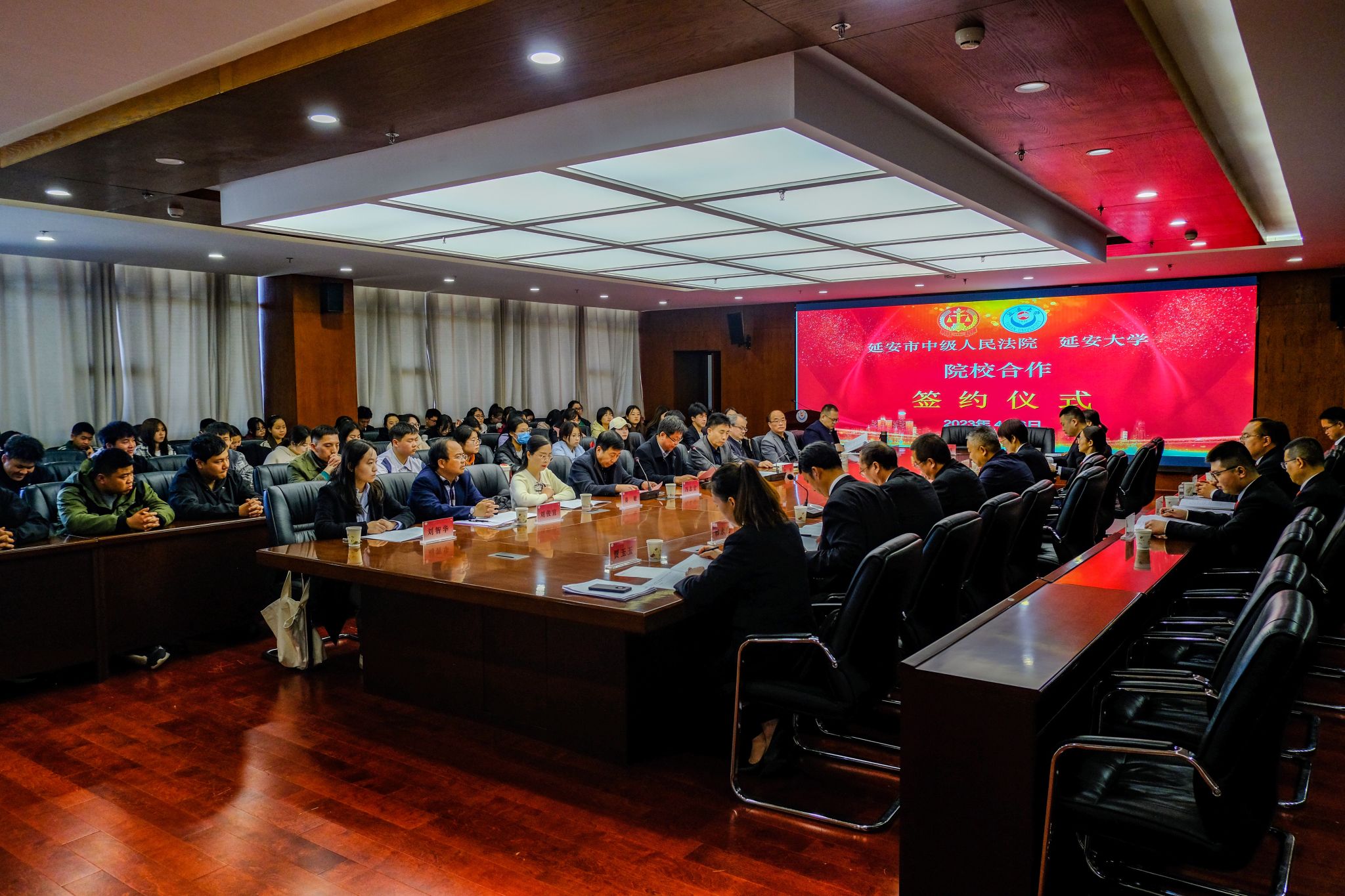 2023年4月6日下午,我校与延安市中级人民法院院校合作交流签约仪式在新校区行政楼二楼会议室举行。延安市中级人民法院党组书记、院长刘群,党组成员、副院长刘文武,我校副校长吕达、人事处处长雷伟、政管学院院长冯志宏、政管学院党委书记李红金、政管学院副院长秦敏,延安市中级人民法院法官代表,法学专业师生代表等参加了会议。会议由冯志宏主持。