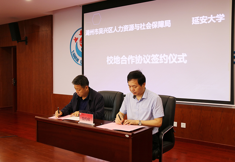 签约仪式上,高峰部长介绍了近年来延安地区的经济发展状况及延安大学悠久厚重历史和特色人才培养方式,并表示对与吴兴区校地合作的前景充满信心。郭士忠副部长介绍了吴兴区的历史人文环境及近年来的人才招聘优惠政策,强调了湖州市吴兴区在区位、交通、文化底蕴、生态环境、经济发展等方面的优势,对今后的合作方向提出建议:一是加强双方实习、见习合作;二是邀请在校师生参加吴兴区当地招聘会,并给予1500元的交通补贴;三是鼓励当地企业进校园,进行校园招聘;四是深化校地合作,互设就业基地和工作站;五是欢迎创业学生入驻吴兴创业中心城。