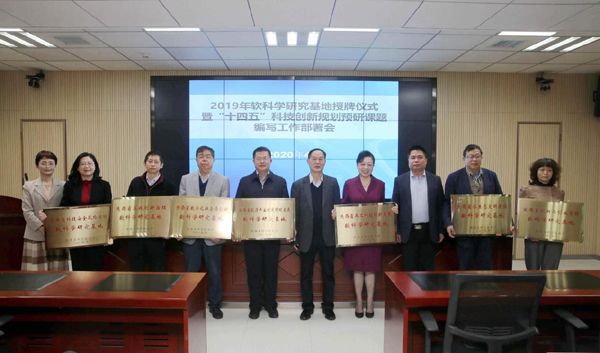 4月24日上午,陕西省2019年软科学研究基地授牌仪式暨“十四五”科技创新规划预研课题编写工作部署会在陕西省科技厅统筹资源中心报告厅举行。陕西省科技厅副厅长赵怀斌、政策法规处处长王军,省软科学研究基地代表、“十四五”科技创新规划预研课题主要负责人、我校副校长杨伟宏及科研处相关负责人出席授牌仪式。