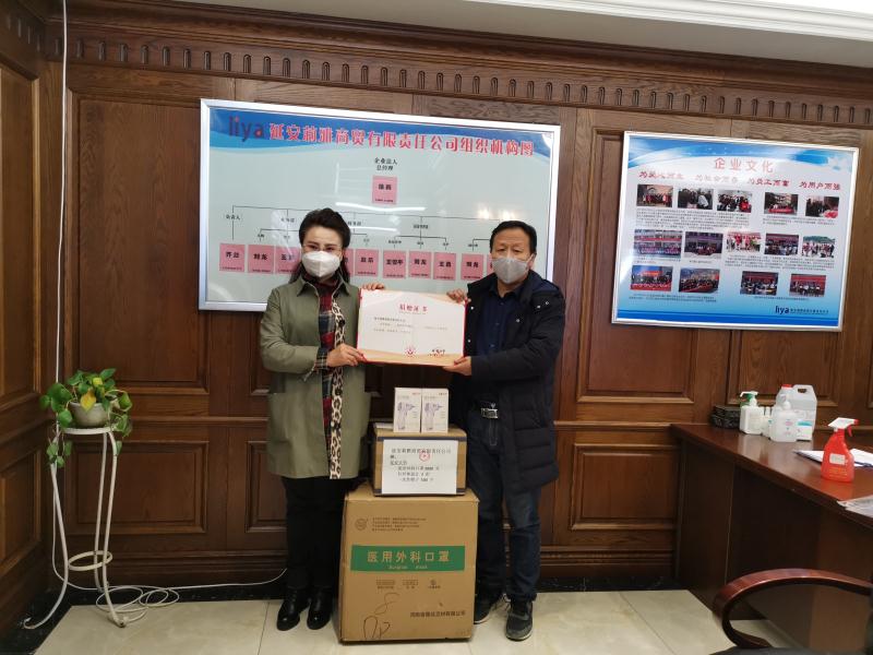 疫情无情人有情,2月22日下午13时,延安莉雅商贸有限责任公司总经理徐莉代表公司主动向学校捐赠抗疫物资。我校后勤管理处张志宇副处长代表学校接受了捐赠,并向徐莉总经理颁发了捐赠证书。张志宇副处长对延安莉雅商贸有限责任公司面对疫情面前的担当与大爱精神表示敬佩,对公司雪中送炭的情谊表示了诚挚的感谢,并表示一定会妥善保管和使用好这批抗疫物资。这次延安莉雅商贸有限责任公司捐赠给我校的抗疫物资价值2万余元,包括民用N95口罩200个、额温枪2个、一次性医用外科口罩2000个、一次性医用帽子500个。