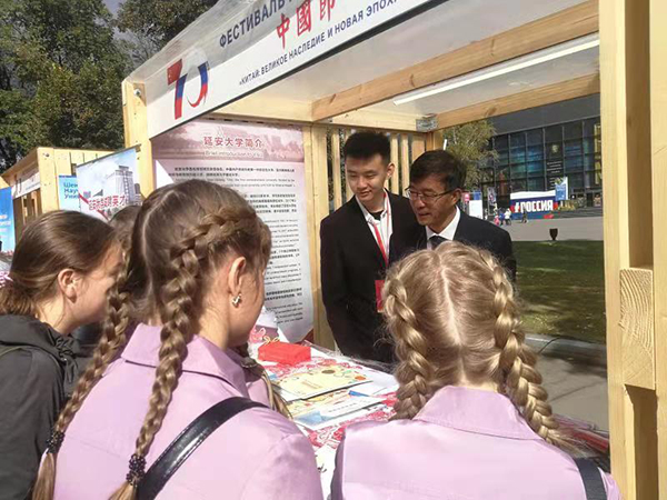 9月14日,中国(陕西)高等教育展开幕式在俄罗斯首都莫斯科国民经济成就展览馆工业馆前广场举行。省委副书记贺荣出席“中国节”开园仪式并致辞,并与俄罗斯联邦国家杜马教育委员会副主席图托娃·拉丽莎·尼古拉耶夫娜等人视察参展的陕西高校展位。省委教育工委书记董小龙对陕西高校进行了推介。当日,我校鲁迅艺术学院学生的陕北民歌《想你哩》《酒瓶抱在怀》、张晓蓉老师的剪纸展演吸引了大量俄罗斯民众,共有3所院校表达了今后合作意向,有20多名俄罗斯学生表达了留学延安大学的意向。
