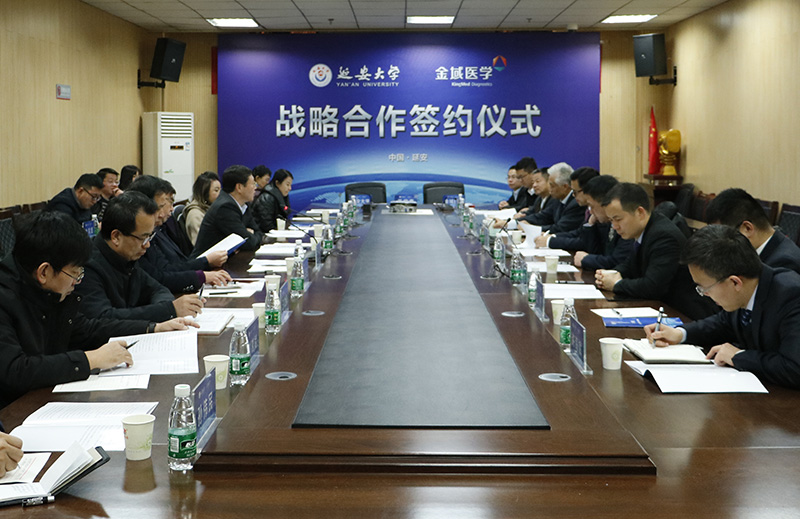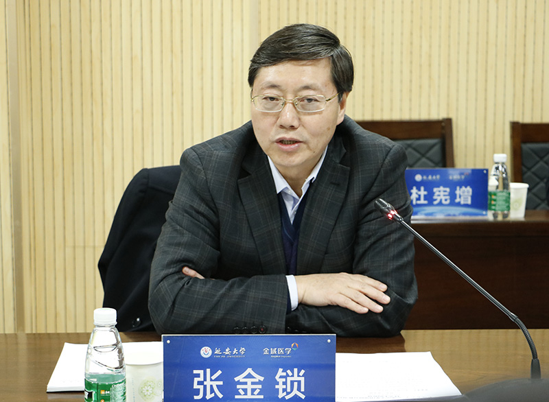 会上,张金锁校长介绍了学校的历史沿革、人才培养、学科专业建设、教师队伍建设、科学研究、社会服务、文化传承创新等方面的情况。张校长指出,金域集团正在积极探索互联网、移动医疗新模式,努力打造国际领先、国内一流的医学诊断信息整合服务提供商,延安大学正处在上水平、大发展的重要机遇期,开展校企合作必将为双方各自的发展提供更加广阔的平台,达到互利双赢、共同发展的目的,同时也必将推动“健康延安”的建设。