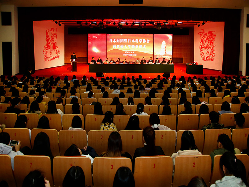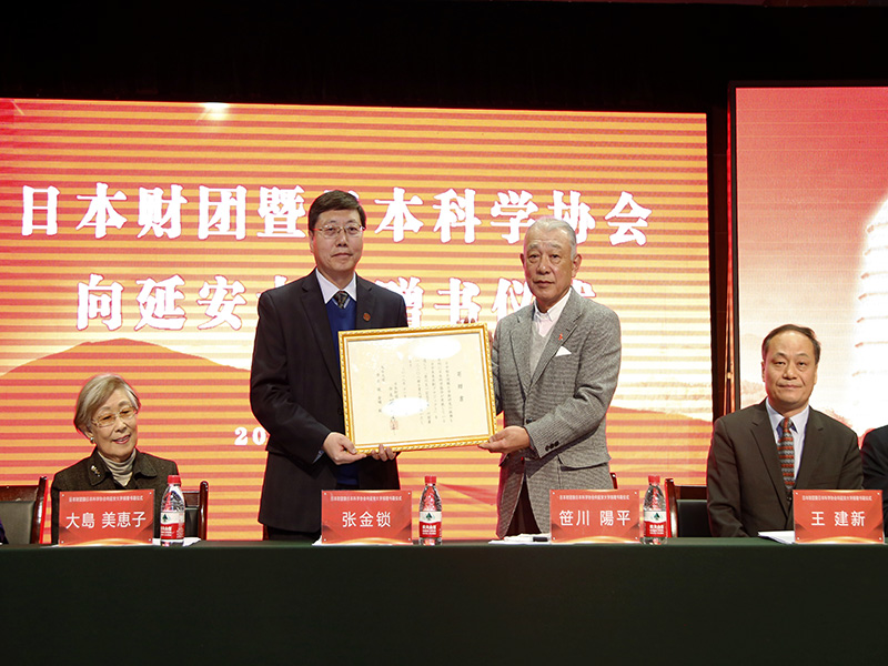 11月29日下午,日本财团暨日本科学协会向延安大学捐赠书籍仪式在5·23音乐厅举行。日本财团会长笹川阳平、日本科学协会会长大岛美恵子、中国教育图书进出口有限公司总经理王建新一行,我校校长张金锁、党政办、教务处、对外交流与合作处、图书馆、国际交流处、医学院、外国语学院负责同志,外国语学院师生代表及各界人士300余人参加了捐赠仪式,捐赠仪式由我校副校长武忠远主持。