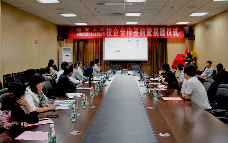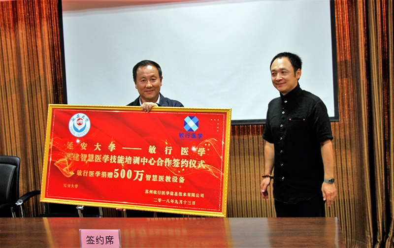 于福东总裁介绍了苏州敏行医学信息技术有限公司的发展历程,该公司专注于医学教育智能化,以医学现代教育技术为支撑,推动医学教育变革,致力于中国医教同质化。随后,于总裁代表公司向我校捐赠了价值500万元的智慧医教设备,医学院党委书记葛彬代表学校接受捐赠。最后,武忠远副校长和于福东总裁代表双方签订了延安大学与敏行医学共建智慧医学技能培训中心。