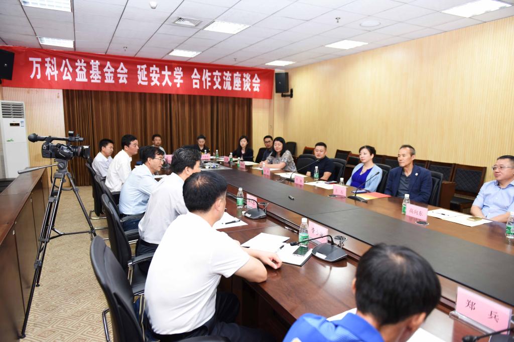 座谈会上,薛义忠书记介绍了我校的基本情况,以及为陕甘宁革命老区的经济、社会发展所作出的巨大贡献。他指出,延安大学是一所历史辉煌、贡献巨大、困难不少、前景光明的大学,在中、省、市和社会各界的大力支持与关怀下,整体的办学条件有所改善,新校区建设紧锣密鼓推进。万科集团坚守价值底线,拒绝利益诱惑,坚持以专业能力从市场获取回报,发展成为国内最大的住宅开发企业;万科公益基金会长期秉承“倡导公益与志愿精神、推动中国公益事业发展”的理念,致力于绿色环保、健康运动、古建筑保护、儿童疾病、扶贫助残、教育事业等公益事业,用爱心回馈社会。希望双方本着合作共赢的原则,就已达成的合作意向进一步加强联系,尽快提出合作框架协议,推动双方合作向实质性方向迈进。