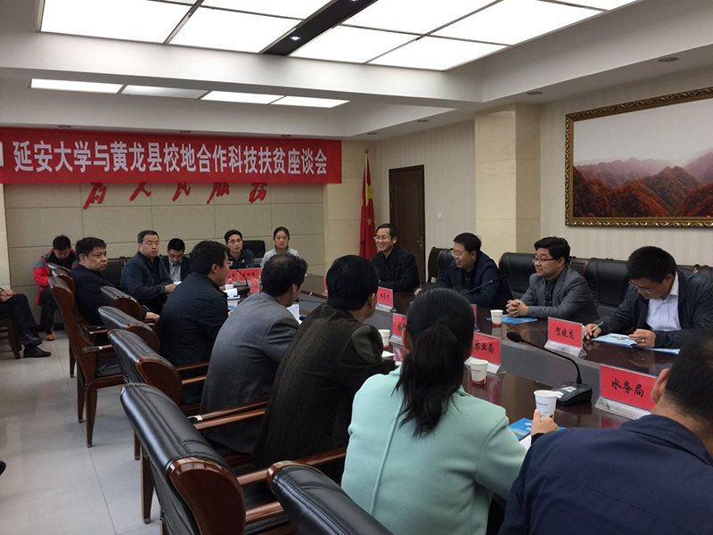 在随后召开的延安大学与黄龙县校地合作科技扶贫座谈会上,黄龙县委常委、副县长张宏江代表县委、县政府对调研组的到来表示欢迎,并从黄龙县自然环境、人文历史、产业发展方面介绍了黄龙县基本情况。他说,近年来,黄龙在农业产业结构调整优化上有了较大改善,取得了一些成绩,但在发展新型农业,促进农业现代化、科技化方面仍存有“短板”,而延安大学拥有雄厚的科研及教学力量,让科研成果走出实验室,为现代农业生产保驾护航,取得双赢,双方有着广阔的合作前景。杨亮才处长简要介绍了延安大学科研工作的基本情况以及近年来在食用菌培植、动物养殖、蔬菜种植等方面与各地进行合作的成果。他表示,加快科研成果的转化不仅是中央的要求,也是服务地方经济发展的需要,开展校地合作必将进一步拓宽了我校的发展空间。