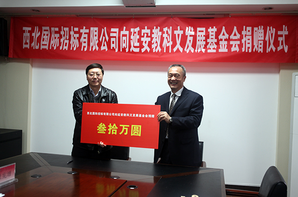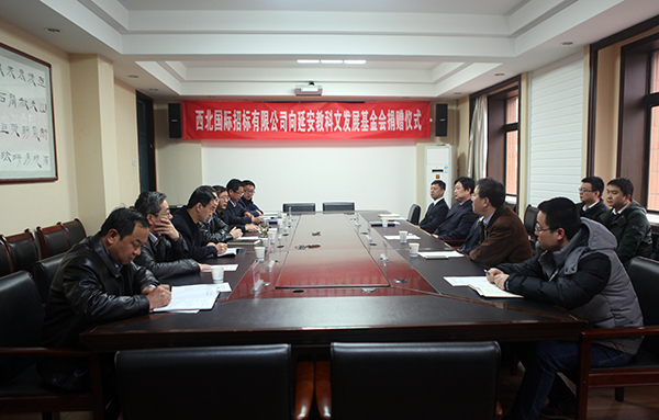 3月23日上午,西北(陕西)国际招标有限公司向延安大学捐款及校企合作签字仪式在我校逸夫楼304会议室举行。捐赠方代表为西北(陕西)国际招标有限公司董事长戈乃西、造价咨询二处经理曲伟、项目管理部经理王斌等一行8人。我校校长张金锁、副校长武忠远,党政办主任刘述进、对外交流与合作处处长吕达、审计处处长刘伟、新校区指挥部副组长王亚轩、对外交流与合作处科长杜宪增参加了捐赠与签字仪式。捐赠和校企合作签字仪式由武忠远副校长主持。